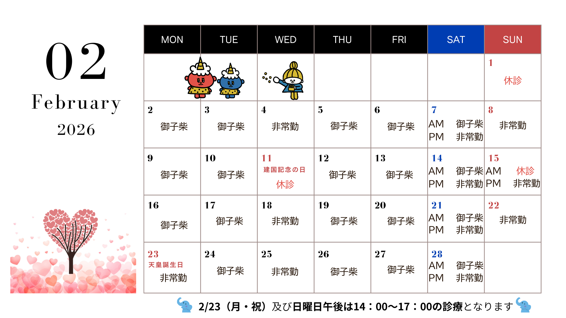 2/10(火)及び2/17(火)は、午前中のみ臨時診察を行います。